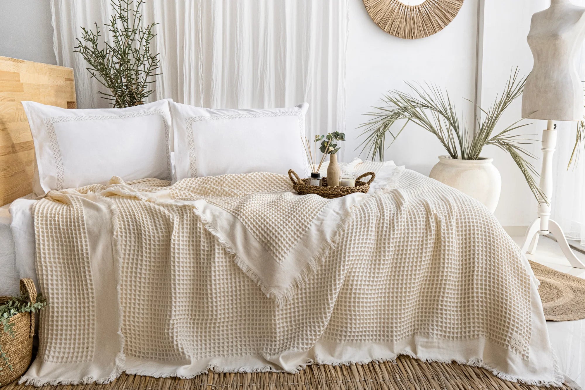 Riva Krem yatak örtüsü, doğal renk tonları ve dokusuyla yatak odalarına sıcak ve huzurlu bir atmosfer kazandırır.